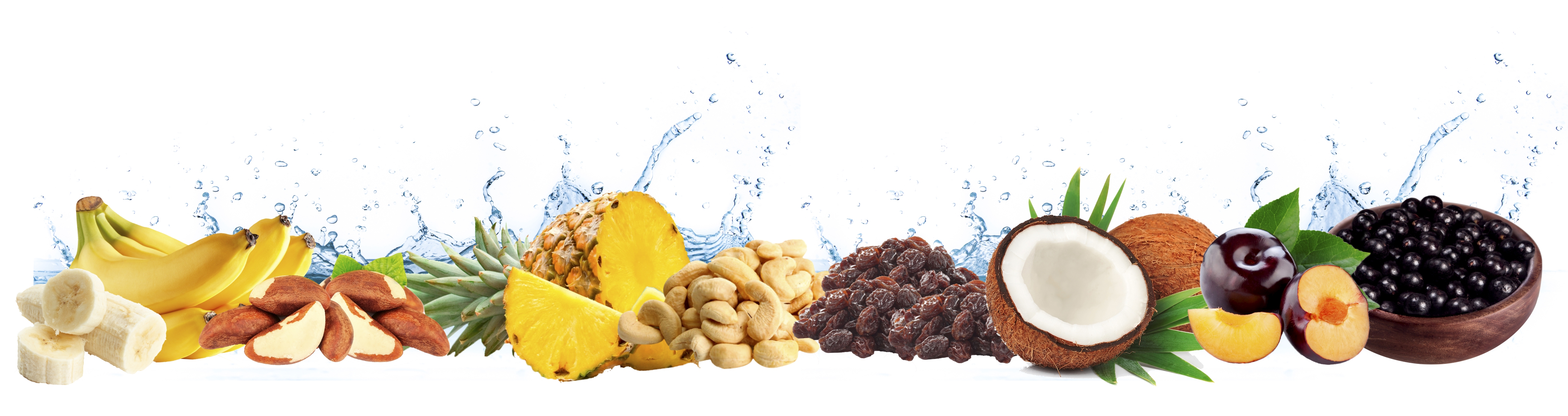 frutas secas (abacaxi, açaí, ameixa, coco, uvas passas) e castanhas (Caju e Pará), todas sem adição de